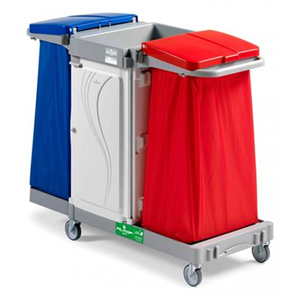 Portasacco dotato di maniglia di spinta ergonomica, ganci porta manico e portapaletta; disponibile nelle versioni 120 lt, 2x60 lt, 1x40 + 1x80 lt