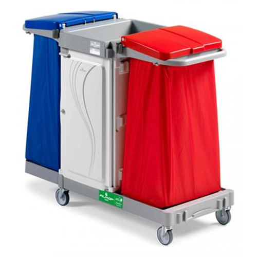 Filmop Alpha 6105 carrello per le pulizie chiuso con ante, cassetti e 2 portasacco, per la raccolta dei rifiuti ed il trasporto di prodotti e attrezzature per la pulizia.