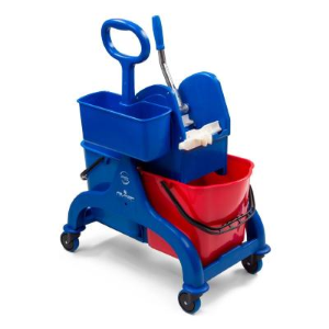 Carrello Filmop Fred con cassetta porta prodotti, doppio secchio strizzatore professionale mop, ruote ed impugnatuta per il lavaggio di pavimenti in grandi ambienti.