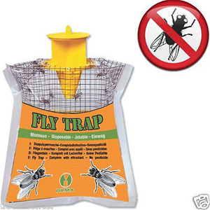 Le FlyTrap sono composte di un sacchetto in nylon dentro cui alloggiare l’attrattivo diluito in acqua, e da un cappello in plastico che funge da punto di ingresso (a forma di imbuto), impedendo contemporaneamente alla mosca di poter uscire.