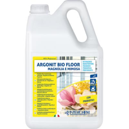 Argonit Bio Floor Magnolia e Mimosa è un detergente probiotico profumante a lunga persistenza per la manutenzione di pavimenti e superfici dure e utilizzo con carrello/mop, frangia o lavasciuga.