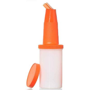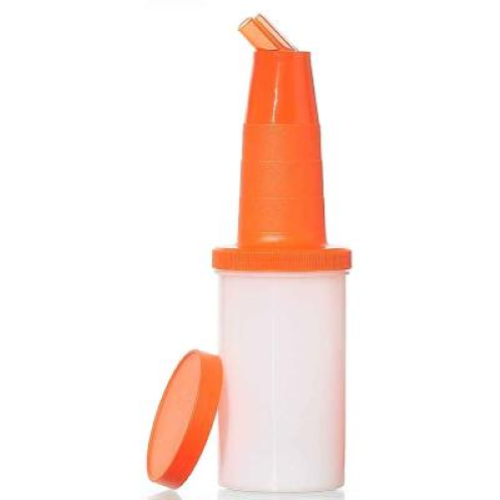 Bottiglia Bar con tappo e beccuccio arancione per bibite, sciroppi e succhi. Confezione : 12 pezzi.