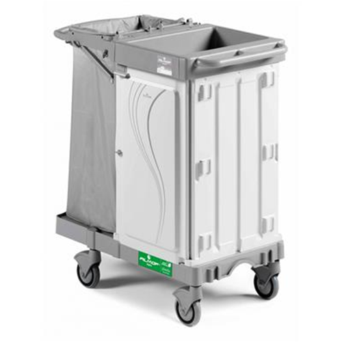 Filmop Alpha Hotel 3300-05 carrello porta biancheria chiuso con antina con 1 porta sacco, vaschette e piccolo ripiano porta prodotti. Ideale in albergo e in comunità.