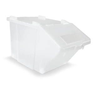 Filmop PICK-UP Food Contact è un contenitore da 45 lt a colonna in trasparente plastica idonea per alimenti, completo di ruote, coperchio e targhetta bianca.