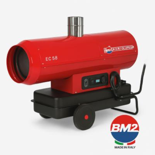 Generatore d’aria calda Biemmedue EC 55 a combustione indiretta da 58,6 kW, utilizza gasolio o kerosene, affidabile per spazi indoor come officine, magazzini, serre, capannoni o tensostrutture.