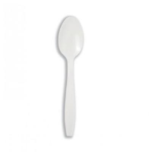 Cucchiaino da dessert in plastica bianca infrangibile e riutilizzabile da 15 cm e peso 3,2 gr.
